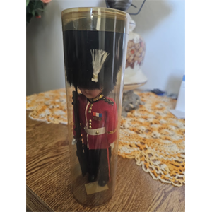 Vintage British Royal Guard souvenir doll featuring the classic red uniform and tall black bearskin-style hat. The figure holds a rifle and wears traditional ceremonial guard attire inspired by the gu